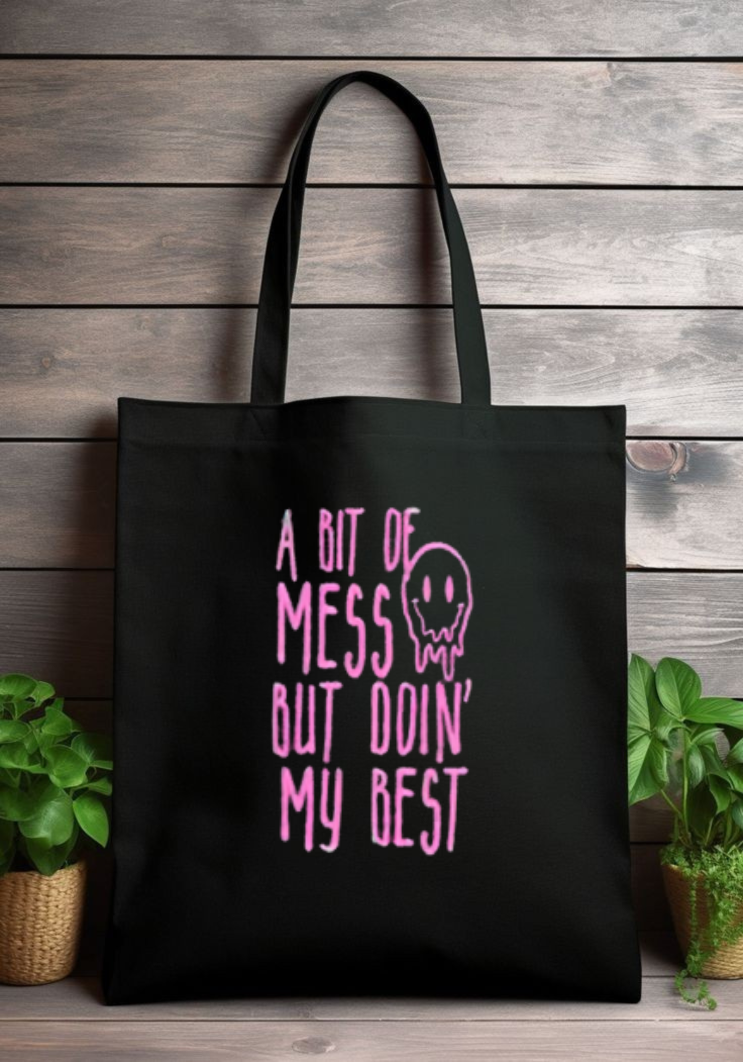 This is a black reusable tote with a screen print transfer pressed onto it.