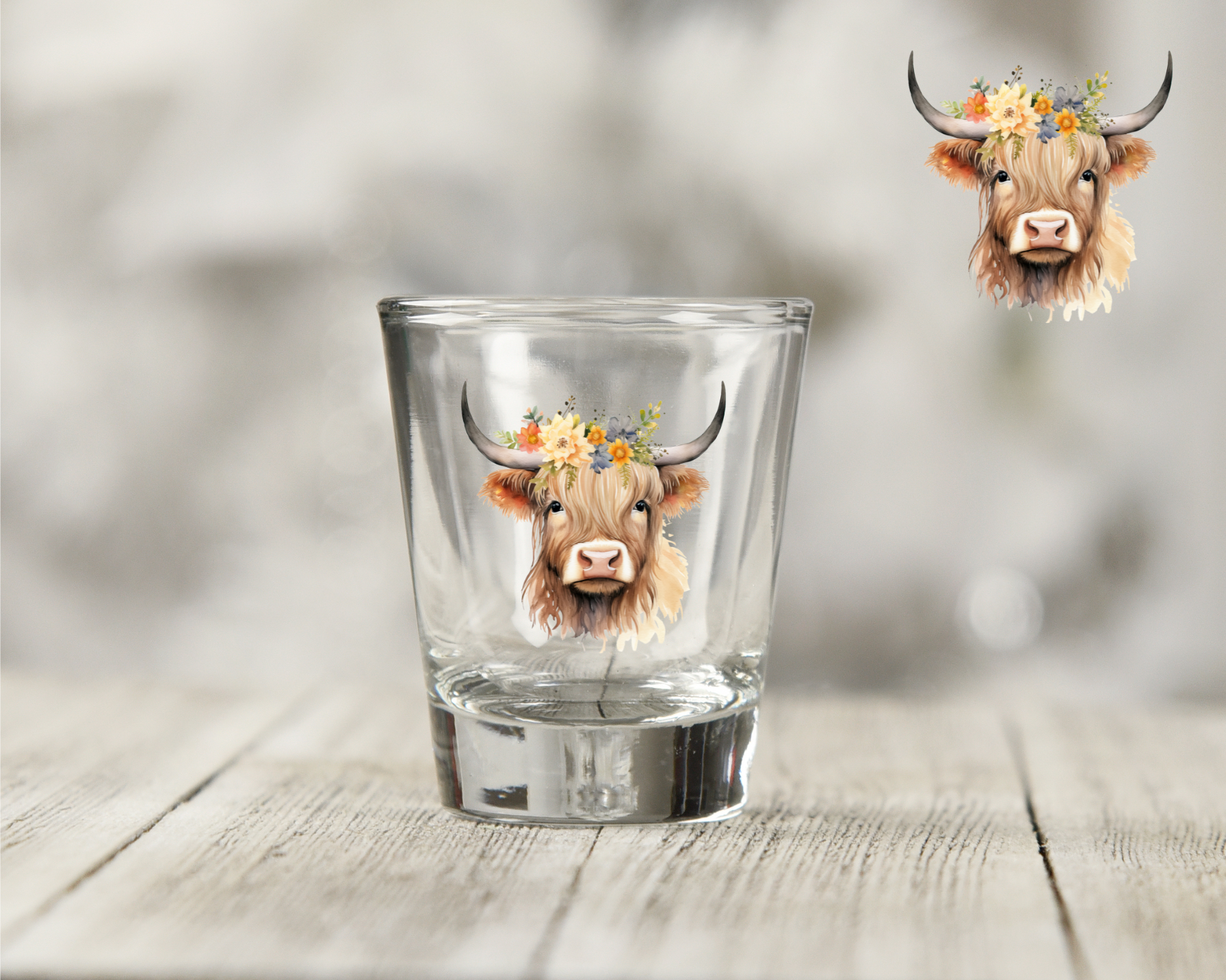 1.5 oz heavy base shot glass with a UV DTF Transfer.